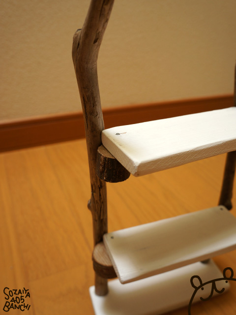 ↑板と流木の接続部分に、木の輪切りパーツを使っています。