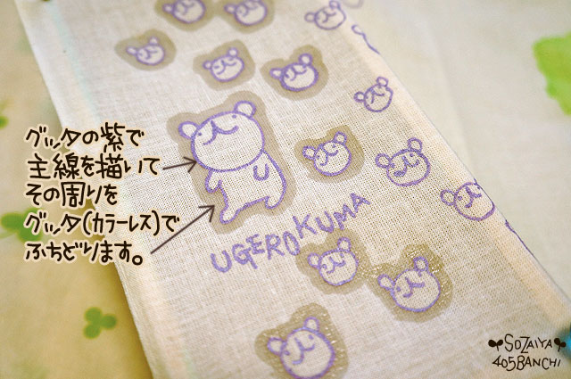 厚みがある場合は、カラーレスグッタが布の繊維にきっちり染み込んでから