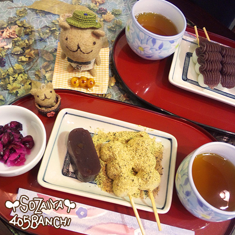 ようかん、串だんご2本、漬物とお茶がついて500円(´▽`*)