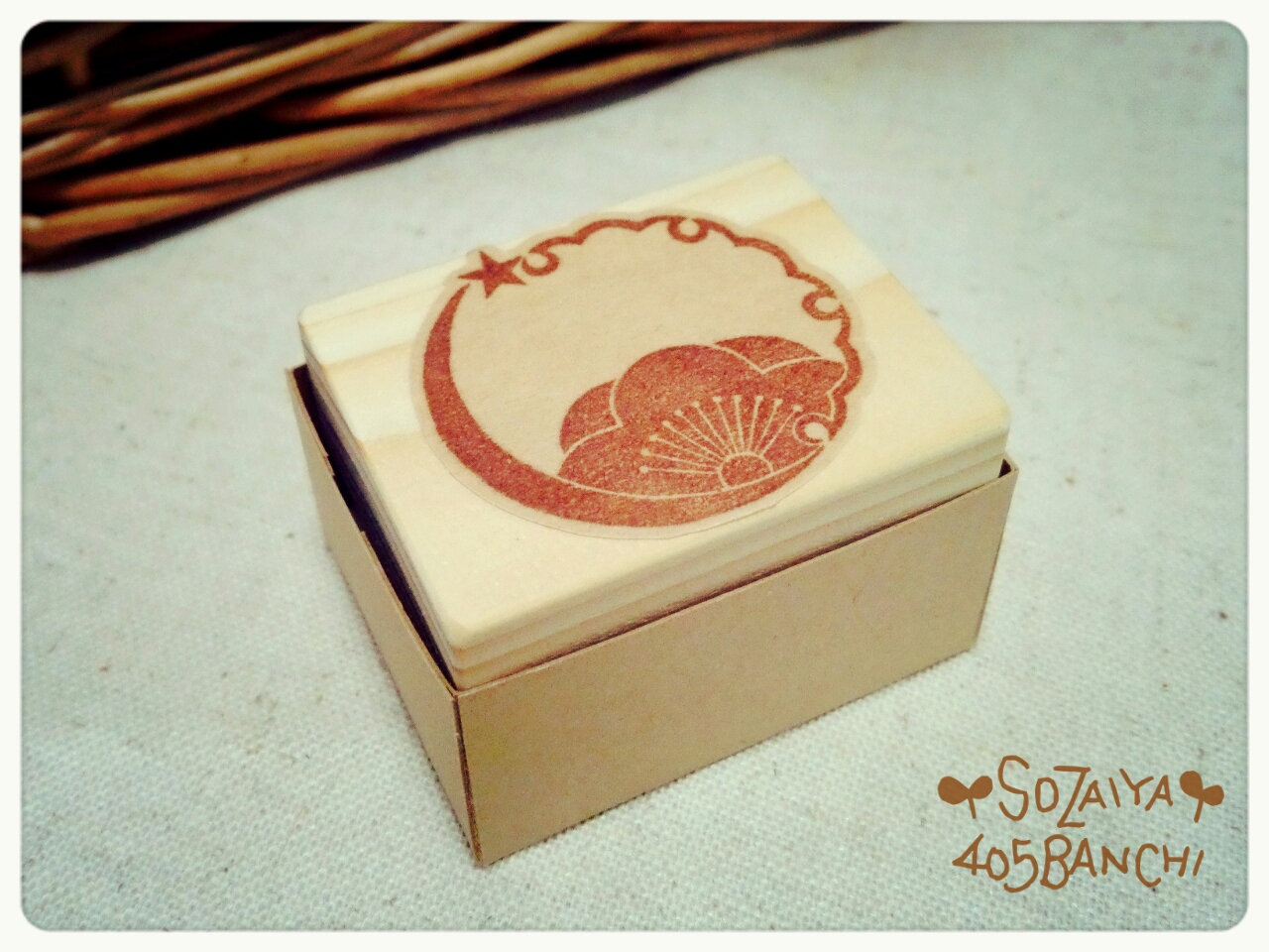 木の持ち手に付けて、厚紙で作った箱もいっしょに。