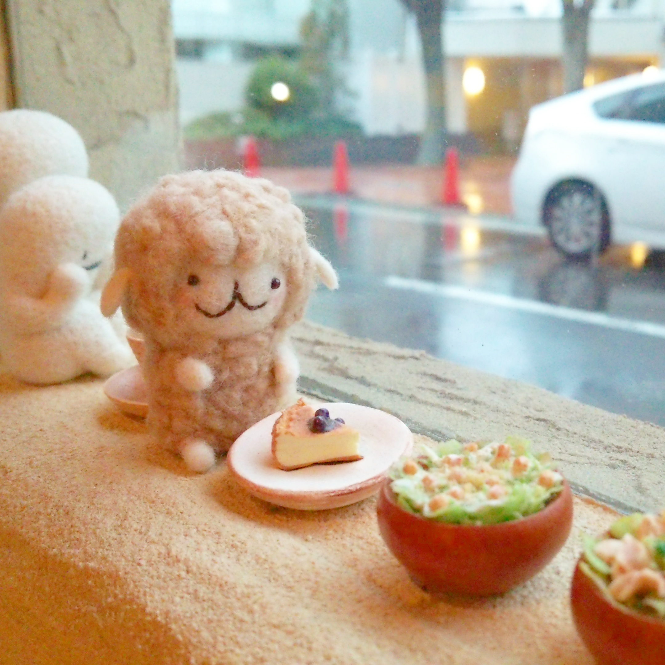 窓際のミニチュアフードに夢中のもこなちゃん(´▽`*)