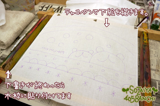 デザインが決まったら、手ぬぐいにチャコペンで下絵を描きまーす。