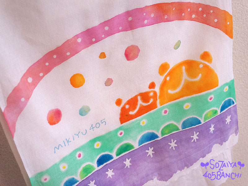 手ぬぐい(さらし)に手染めしていく、というものです。