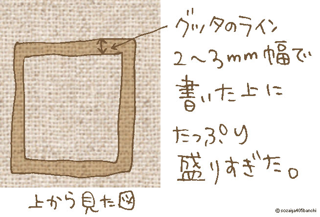 盛りすぎたグッタが、ラインから溢れ出し、セタシルクを塗った部分まで流れていった事と
