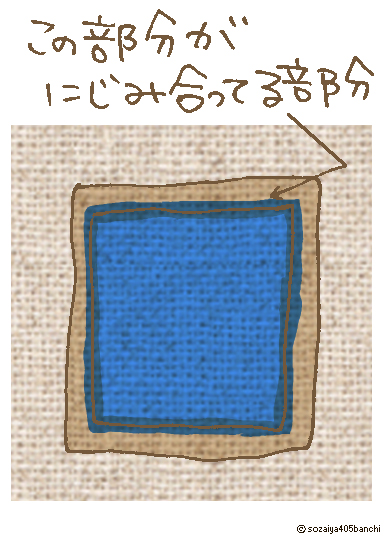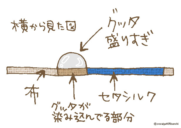 布にグッタを乗せて数秒すると、布の繊維に染み込んでいくのです。