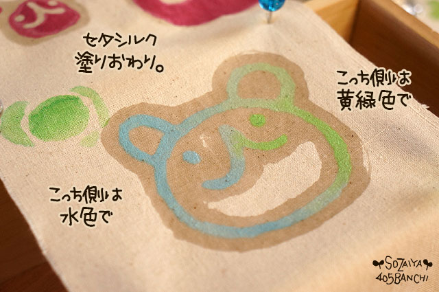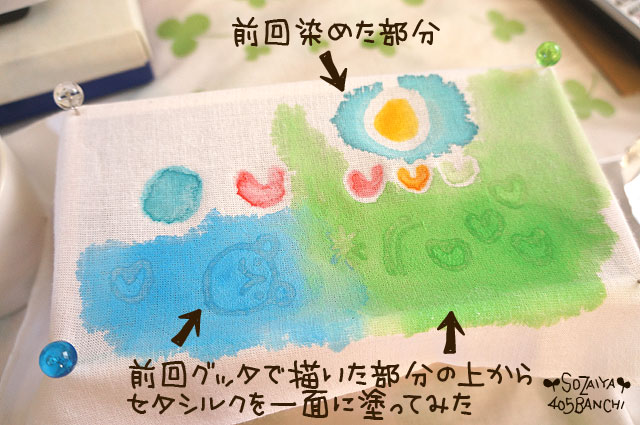 グッタを落とした部分、微妙にセタシルクで染まっちゃってました。