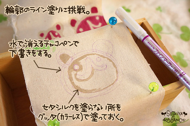 ②セタシルクを塗らない部分を、カラーレスグッタで描く。