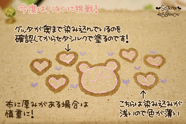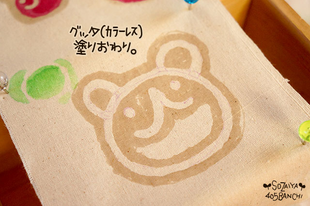 厚みがある場合は、カラーレスグッタが布の繊維にきっちり染み込んでから