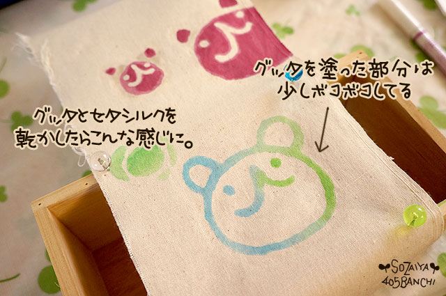 カラーレスグッタが乾く前に、セタシルクで塗るんです。