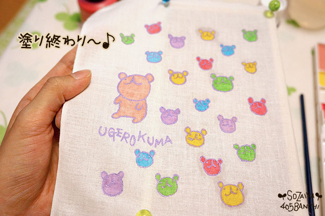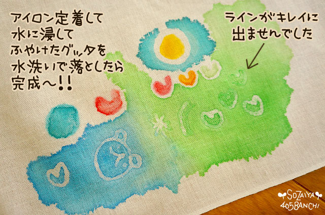 乾燥→アイロン定着→水に浸してふやけたカラーレスのグッタを水洗い→乾燥
