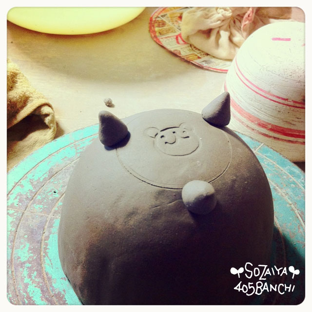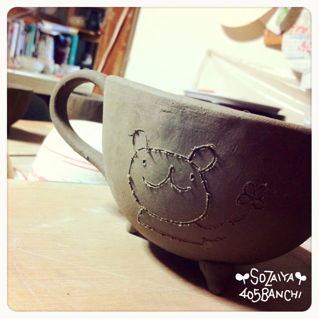 まぁるく仕上げた器に、三本足をつけて、うちのくまのマークも入れます。