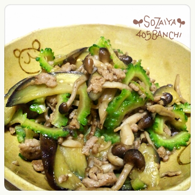←ゴーヤーと、ナス・しめじ・豚挽き肉を