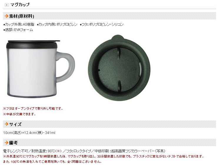 中紙:フジカラー写真プリント カップ外側:AS樹脂 カップ内側:ポリプロピレン・TPEエラストマー フタ:ポリプロピレン・シリコン 底部:EVAフォームまたはTPEラストマー