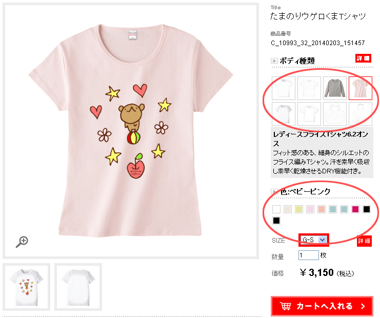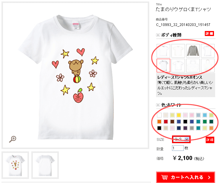 「デザインガーデン」のすごい所は、Tシャツの色だけでなく、メンズ、レディース、キッズなどが自由に選べること!各商品の詳細ページをご覧頂くと、↓以下のようになっています。