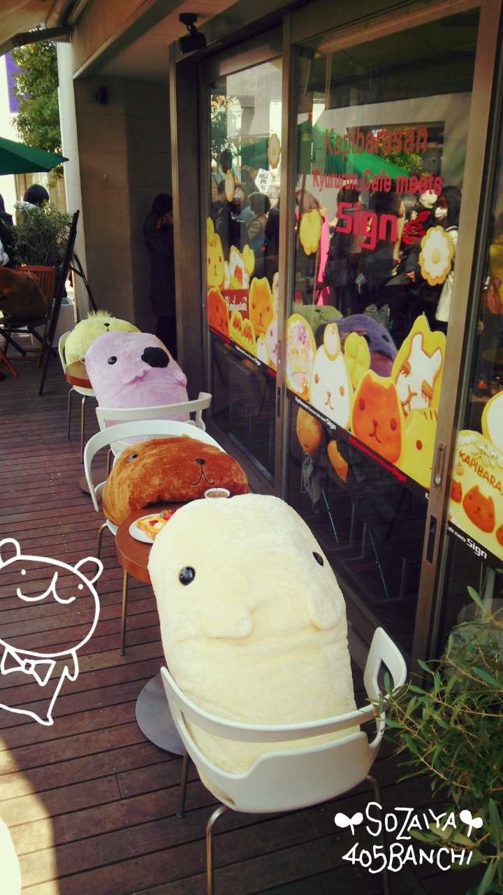 カフェテラスには、カピバラさんたちがカフェタイムを楽しんでいます( *´∀`*)
