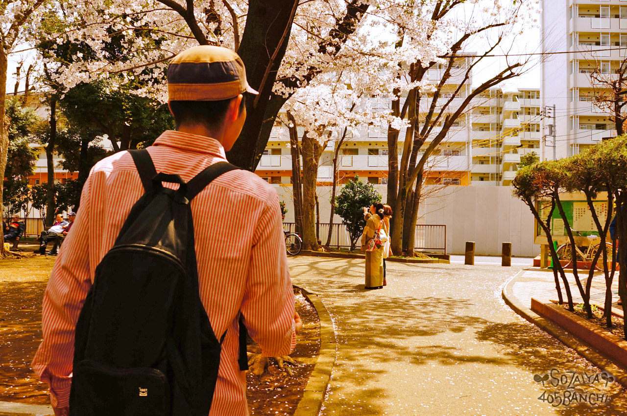 桜を見上げている若菜さんとチカダさん、そこへ向かうLUPOPOのマスター・花井さんです^^*