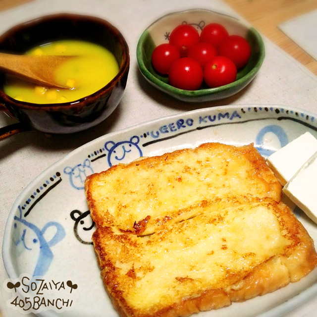 フレンチトースト、クリームチーズ、プチトマト、コーンスープ。